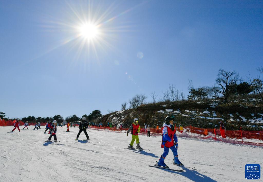 在天津蓟洲国际滑雪场,教练与小朋友在雪道上练习滑雪(2月20日摄)。