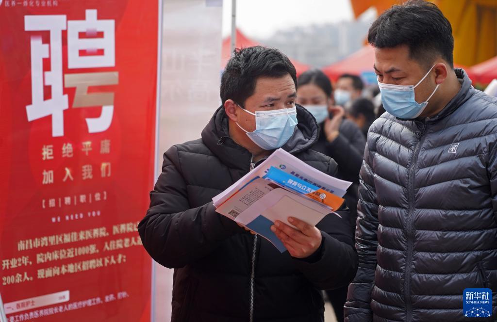 2月25日,江西省南昌市湾里管理局开展“春风行动”线下招聘活动。这是求职者在招聘会现场交流。