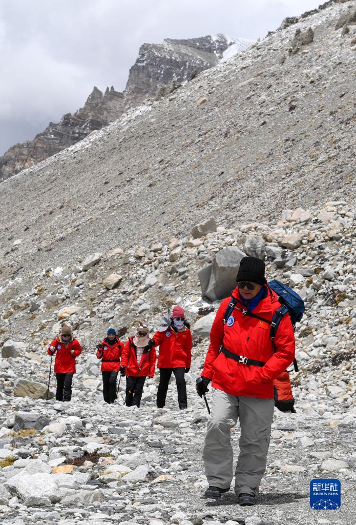 朱彤(右一)和科研人员在珠峰大本营和东绒布冰川间徒步穿梭(5月1日摄)。