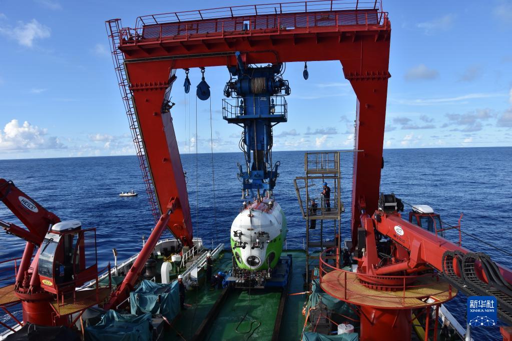 2021年8月18日,工作人员在西太平洋准备从“探索一号”科考船甲板布放“奋斗者”号。