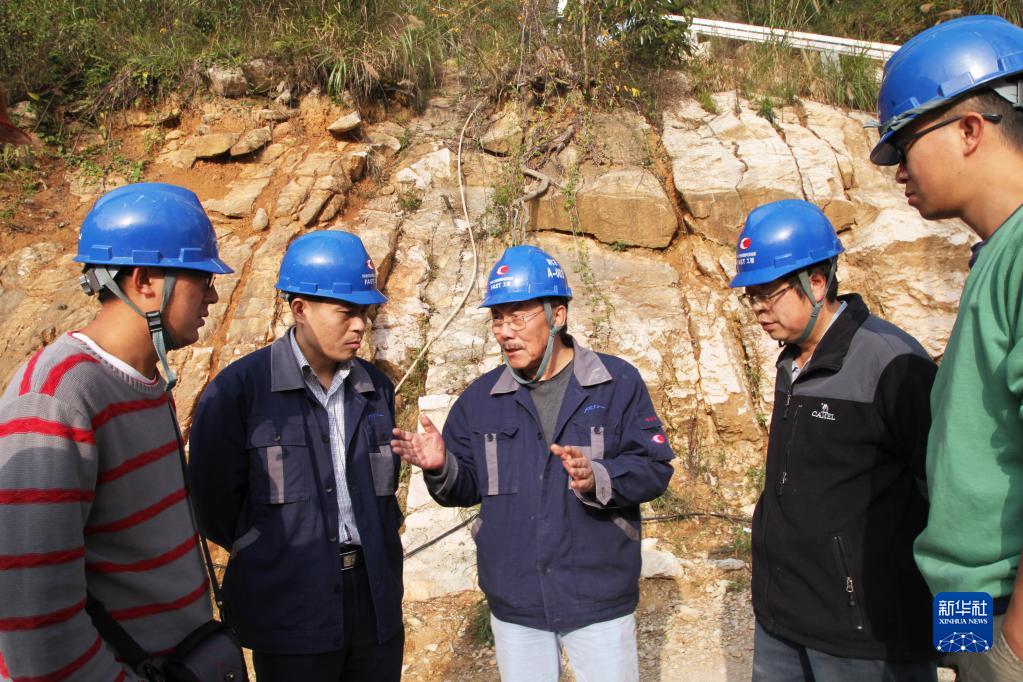 天文学家南仁东(中)与工程技术人员在大窝凼施工现场检查施工进展(2014年12月1日摄)。