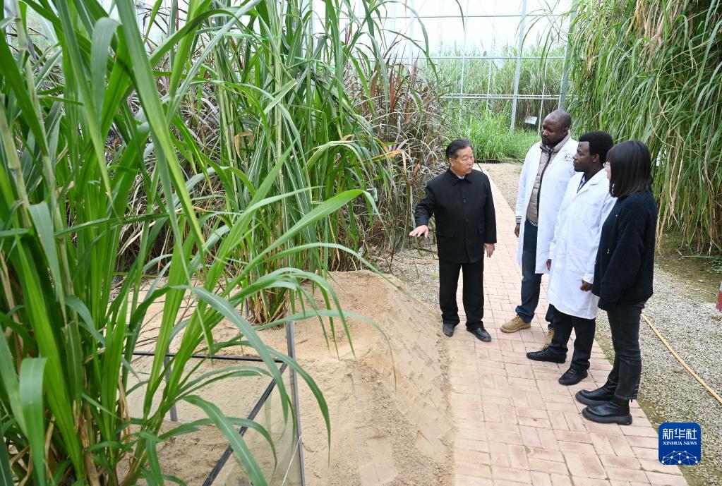 2021年11月23日,福建农林大学菌草专家林占熺(左一)在国家菌草工程技术研究中心菌草种质资源圃给外国留学生(左二、左三)讲解菌草的种植培育技术。