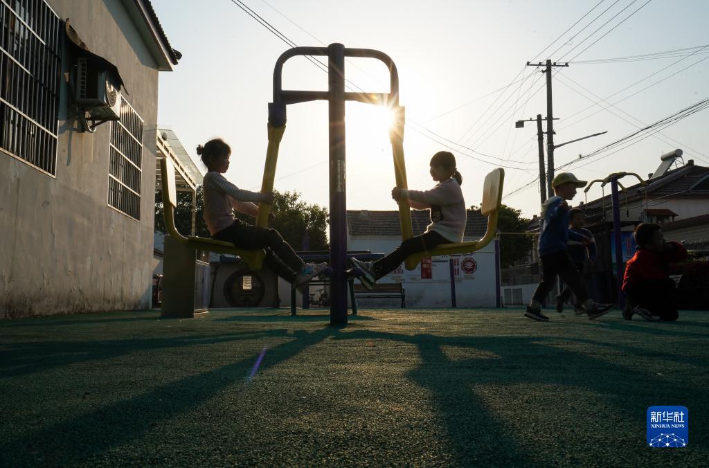 小朋友在镇江市世业镇永茂圩自然村的文化活动广场玩耍(2020年4月13日摄)。