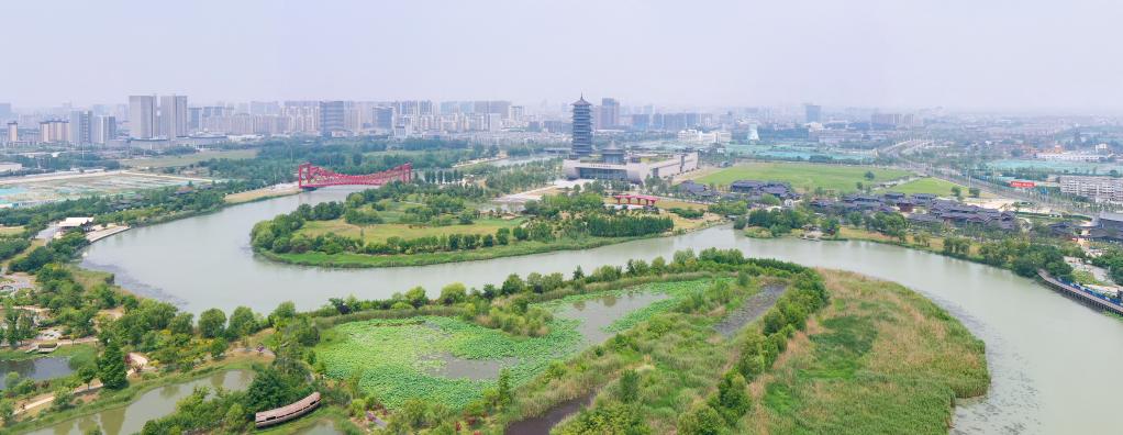 这是2022年5月25日拍摄的扬州市运河三湾景区(无人机照片)。