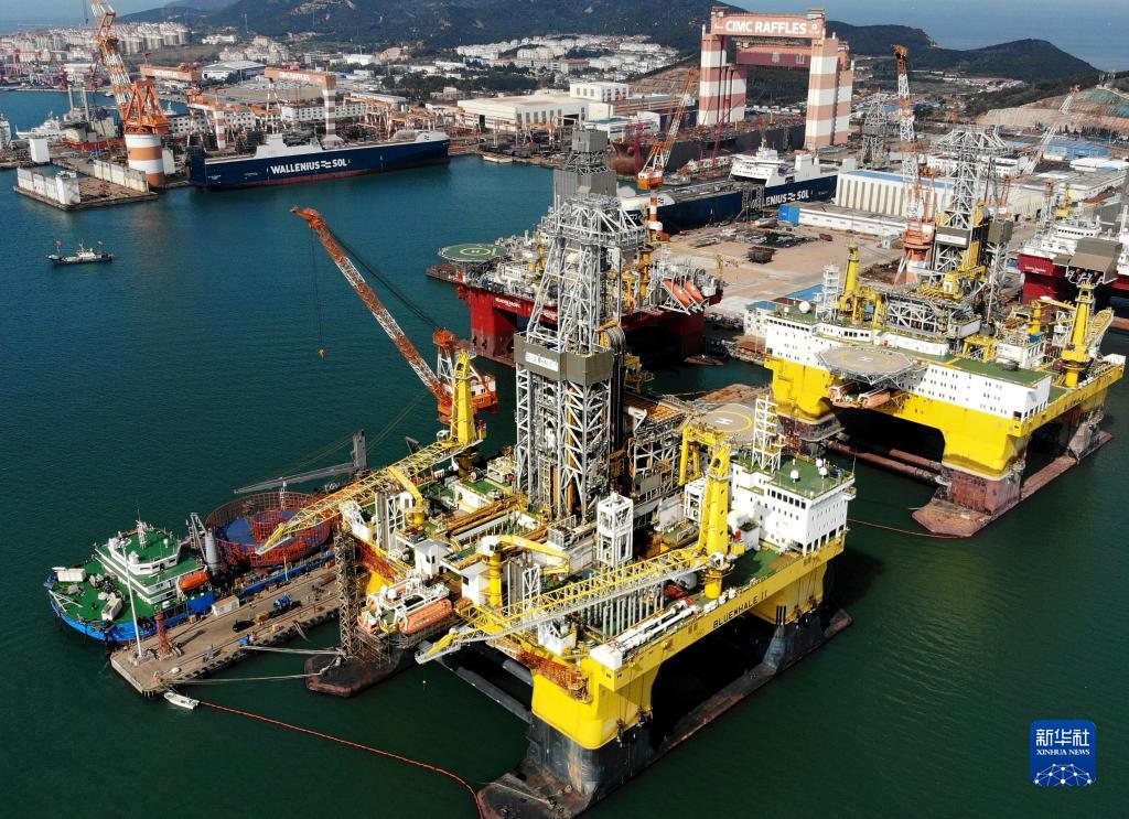 这是“蓝鲸1号”(前右)及姊妹平台“蓝鲸2号”(前左)在其生产基地中集来福士海洋工程有限公司烟台基地进行维护和保养(2021年10月18日摄,无人机照片)。