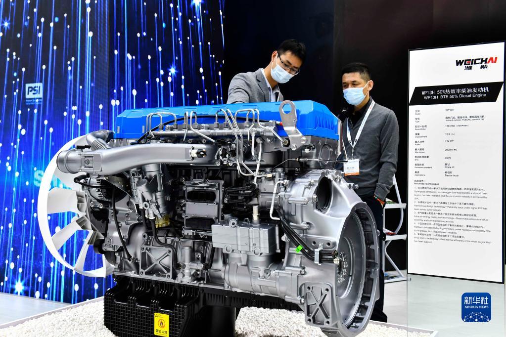 在山东济南召开的第二届世界内燃机大会上,潍柴集团展示的高热效率柴油发动机(2021年4月21日摄)。