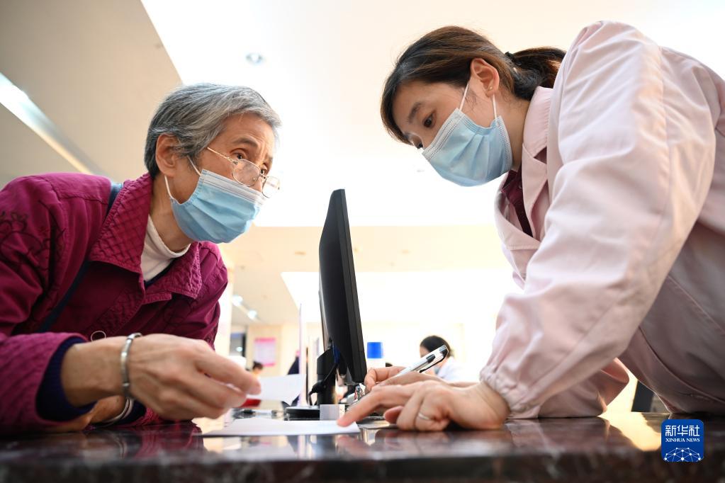 福建省三明市第一医院的医保办工作人员(右)向前来咨询药品报销问题的居民讲解相关政策(2020年11月18日摄)。