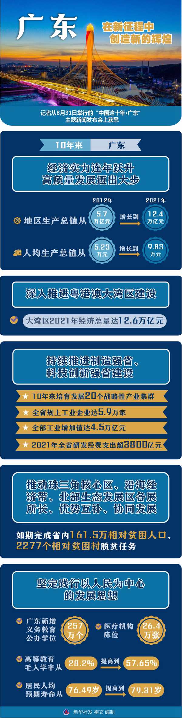 广东持续推进制造强省、科技创新强省建设。10年来培育发展20个战略性产业集群,全省规上工业企业达5.9万家,全部工业增加值达4.5万亿元,形成7个万亿级产业集群;2021年全省研发经费支出超3800亿元、10年研发经费支出增长超过2倍。