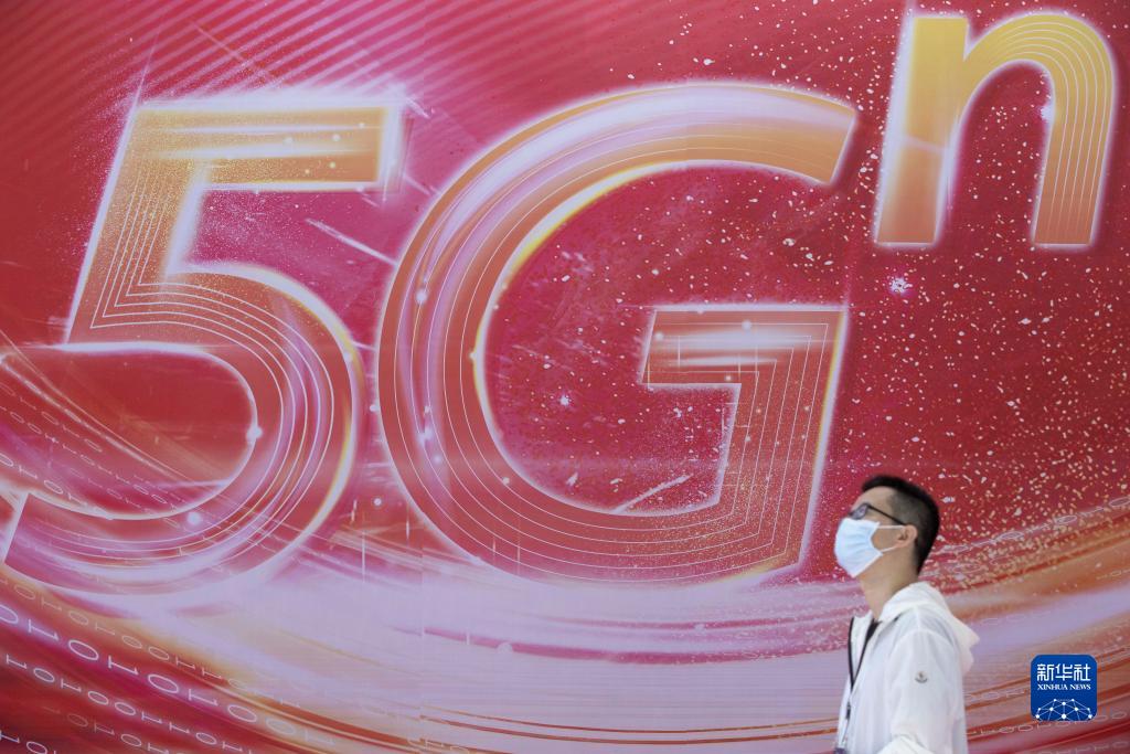 在2022世界5G大会展厅里,一名参展商走过展板(2022年8月10日摄)。