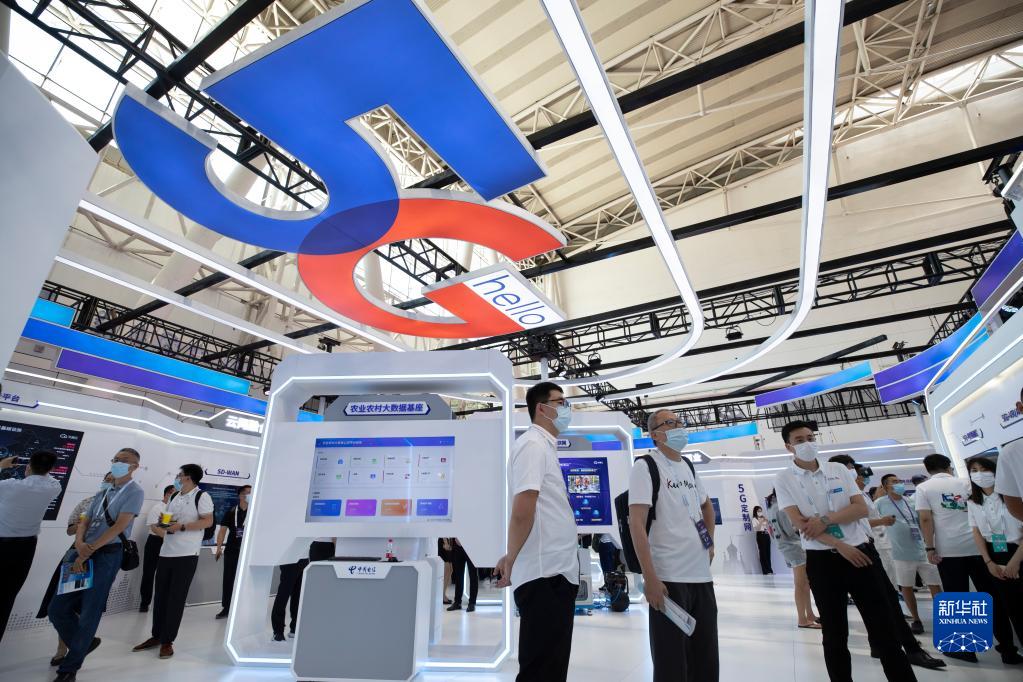 在2022世界5G大会中国电信集团有限公司展区,参观者现场了解5G产品(2022年8月10日摄)。