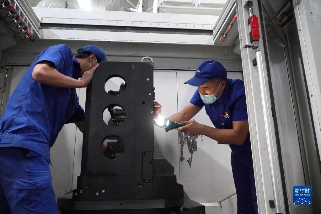 在山东省潍坊市,潍柴集团的工作人员在一条新的生产线上安装调试设备(9月19日摄)。