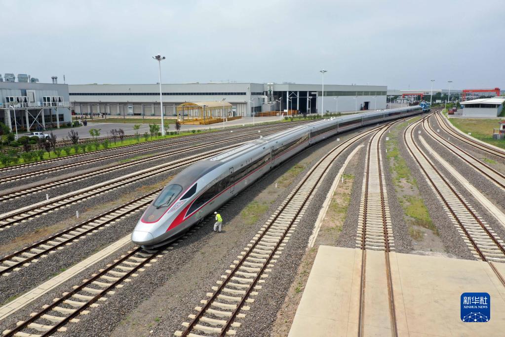 在位于山东青岛的中车四方股份公司,一辆复兴号列车正在出厂(2021年7月1日摄)。