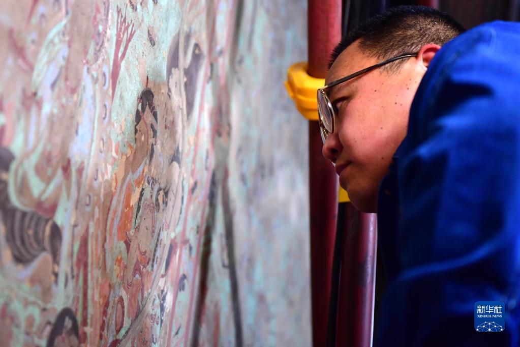 在莫高窟第231窟,敦煌研究院文物保护技术服务中心的壁画修复工作者在修复出现病害的壁画(2022年4月19日摄)。