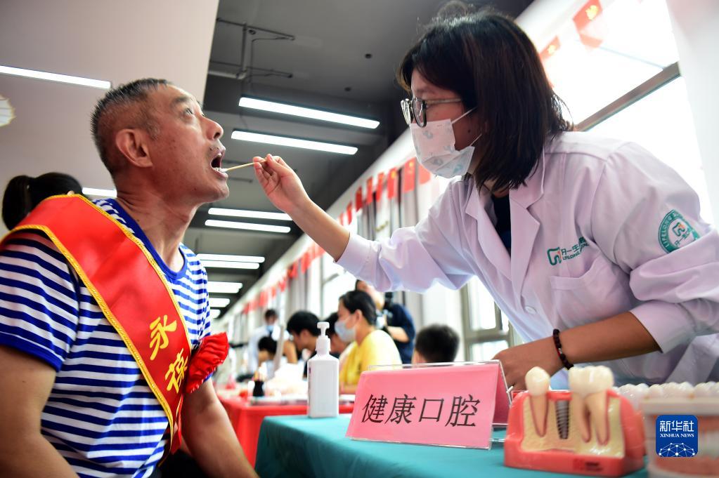 安徽省合肥市蜀山区洪岗社区志愿者为市民检查口腔(2022年7月29日摄)。