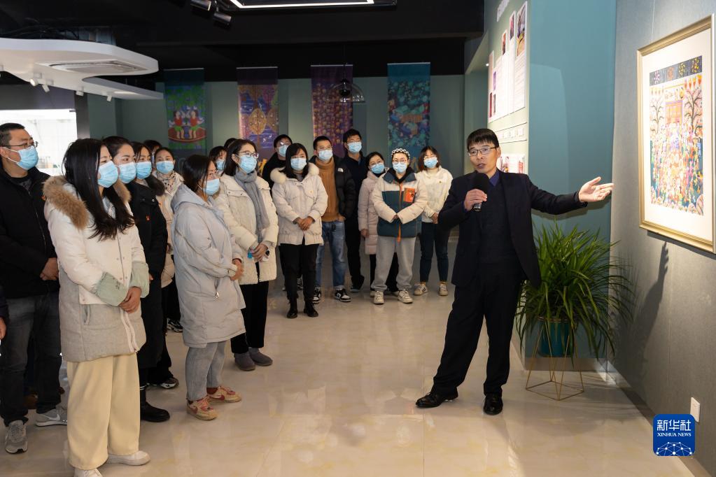12月4日,江苏省南京市六合区农民画美术馆内,一场以江苏省非物质文化遗产六合农民画为载体的党的二十大精神宣讲会举行。这是六合区冶山街道文体服务中心主任胡斌(右一)带领参加活动的基层干部群众参观农民画。