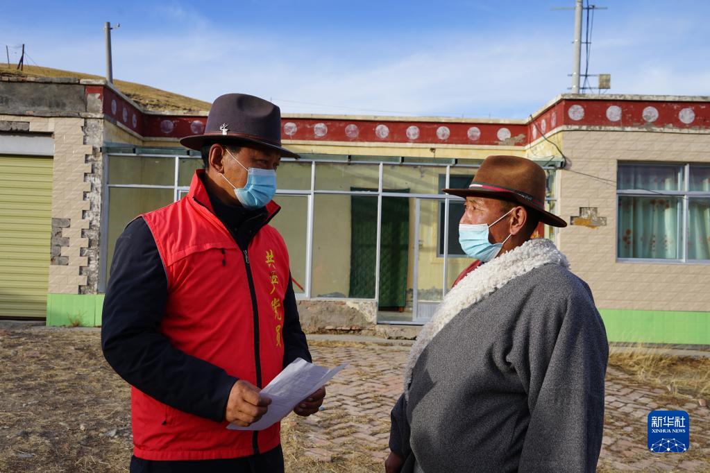 12月9日,青海省海北藏族自治州祁连县野牛沟乡达玉村村支书才让扎西(左)宣讲结束后,与牧民交流。