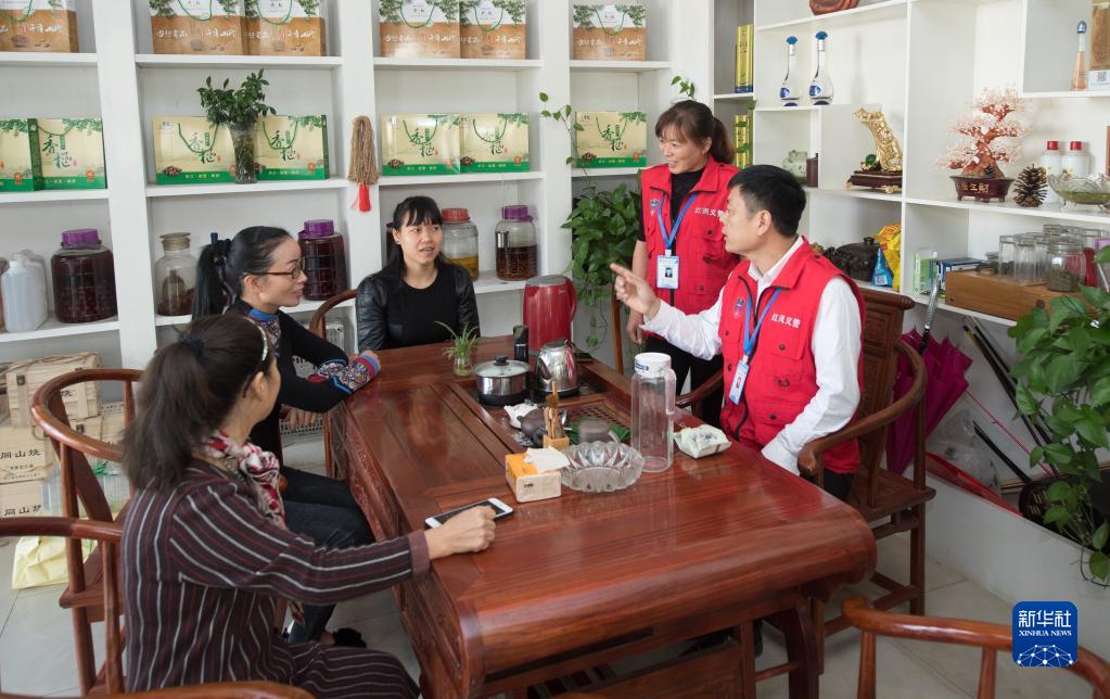 浙江省诸暨市红枫义警工作人员(右一、右二)在枫桥镇调解群众纠纷(2018年10月19日摄)。