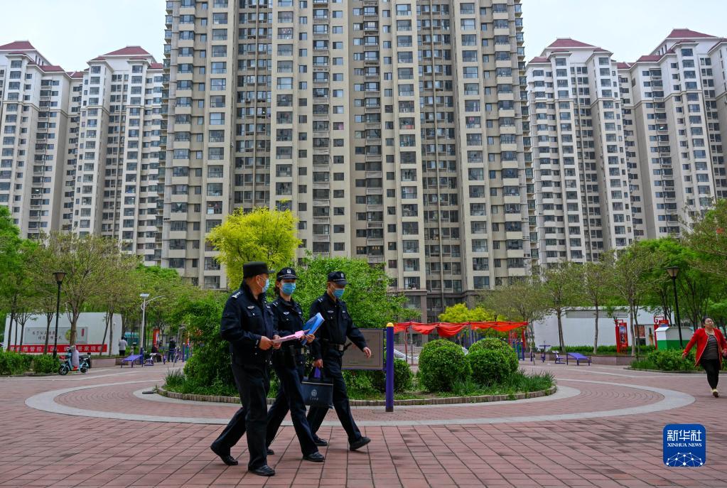天津市公安局津南分局中铁派出所的社区民警吕诗情(中)与民警王洪心(左)、辅警李兆辉在林景家园内巡逻(2022年4月28日摄)。