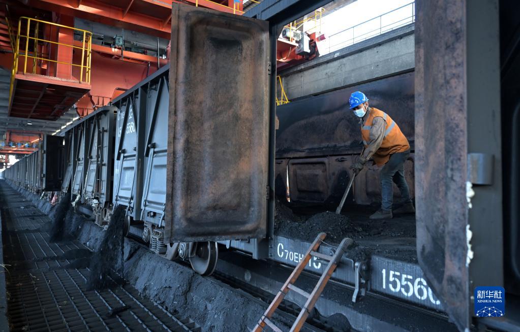 1月19日,在大唐安徽发电有限公司淮南洛河发电分公司,工作人员进行卸煤作业。
