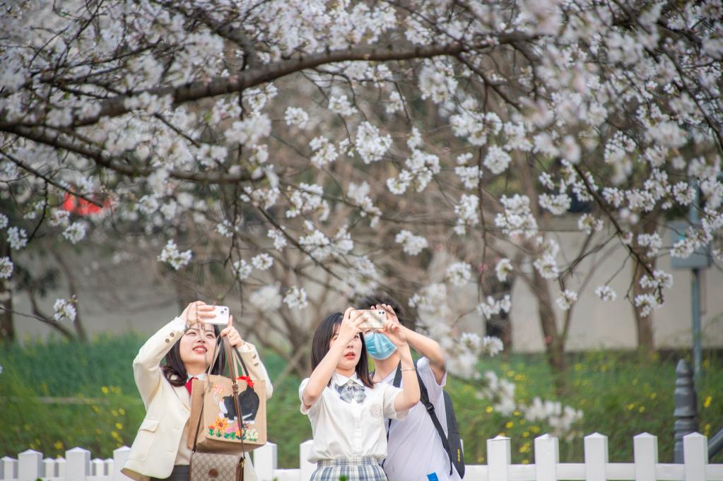 2022年3月14日,游客在武汉东湖樱园赏樱拍照。