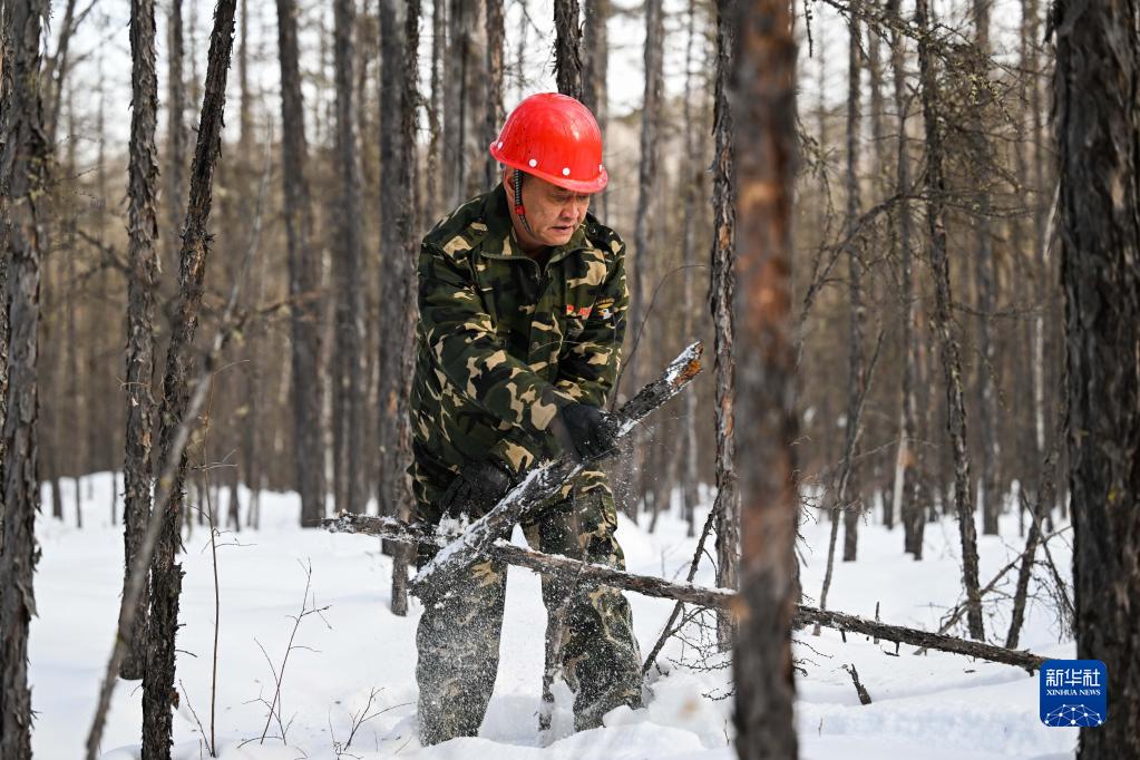 2月22日,周义哲在内蒙古森工集团满归森工公司乌龙岱林场清理杂枝,对森林进行综合抚育工作。
