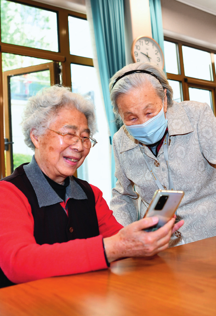 老人在位于河北三河的燕达金色年华健康养护中心老年活动室交谈(2022年5月18日摄)。朱旭东摄/本刊
