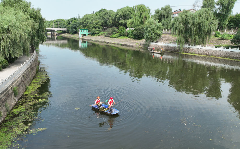 工作人员在湖州市吴兴区埭溪镇进行河道保洁(6月21日摄,无人机照片)。