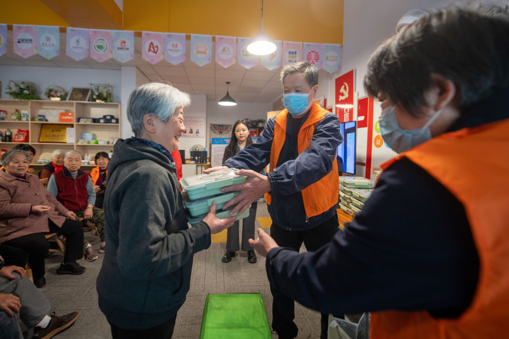 杭州市上城区南星街道白塔岭社区志愿者在社区服务驿站为老人发放免费爱心午餐(2022年11月23日摄)。