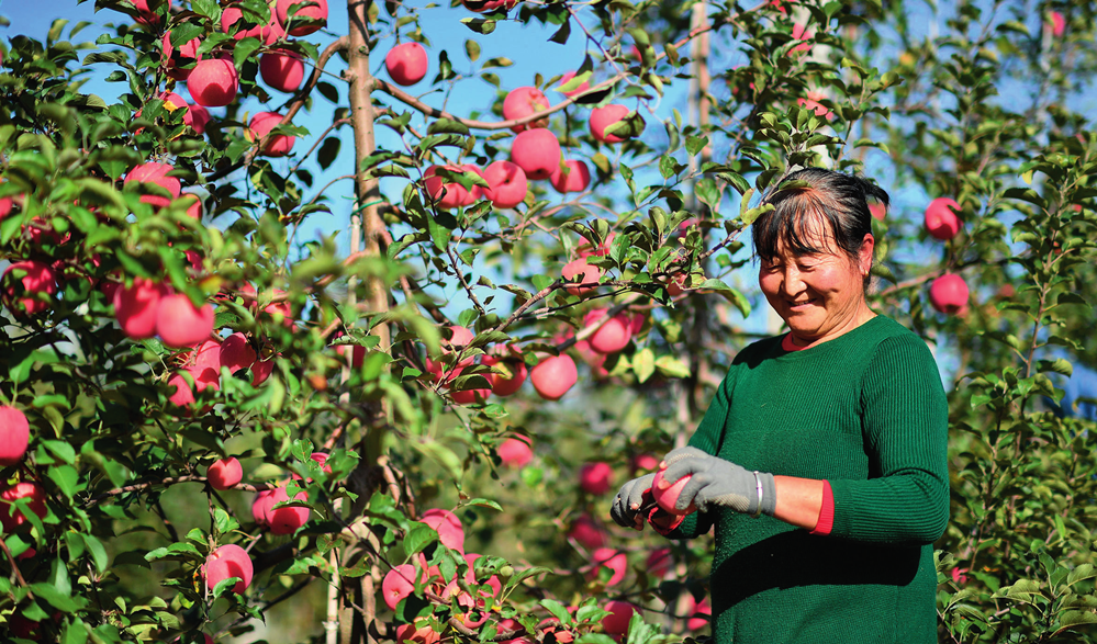 果农在陕西延安市洛川县永乡镇阿寺村一处果园采摘苹果(2022年10月10日摄)。张博文摄/本刊