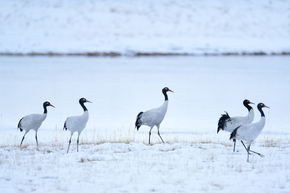 位于青海省的三江源国家公园黄河源园区内的黑颈鹤(2021年10月21日摄)。