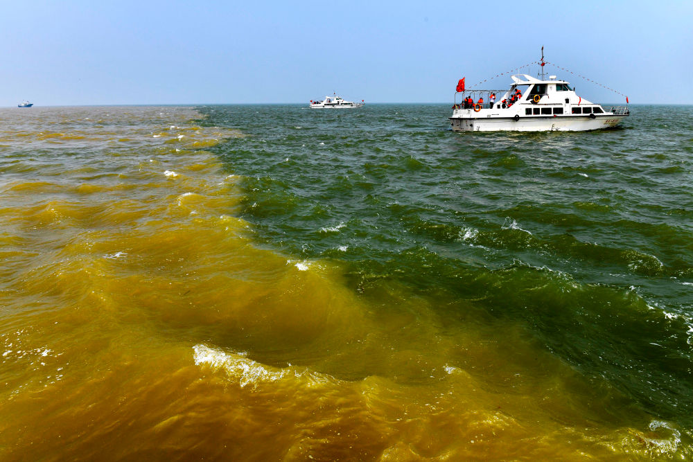 在山东省东营市黄河入海口,黄河汇入渤海,形成独特景观(2021年5月13日摄)。