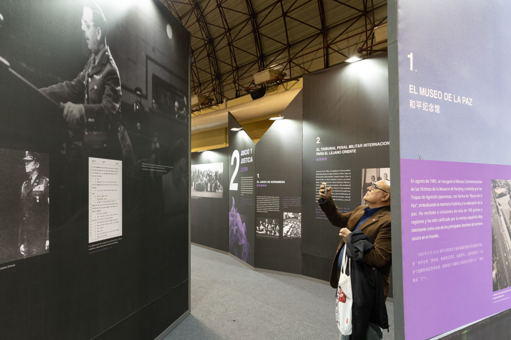2023年10月26日,观众在西班牙马德里参观《世界记忆 和平愿景——南京大屠杀史实展》。 新华社记者孟鼎博 摄