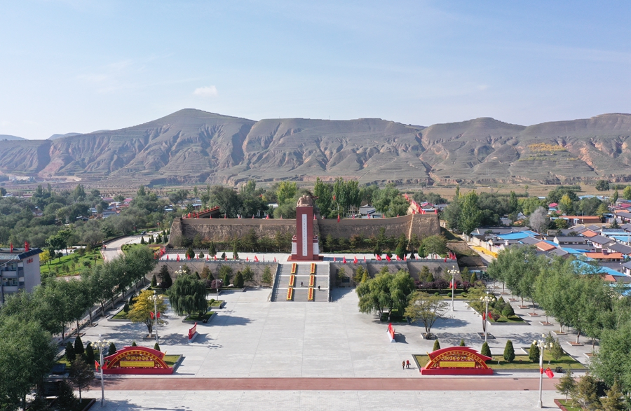 这是位于宁夏固原市西吉县的将台堡红军长征会师纪念园(2021年10月18日摄,无人机照片)