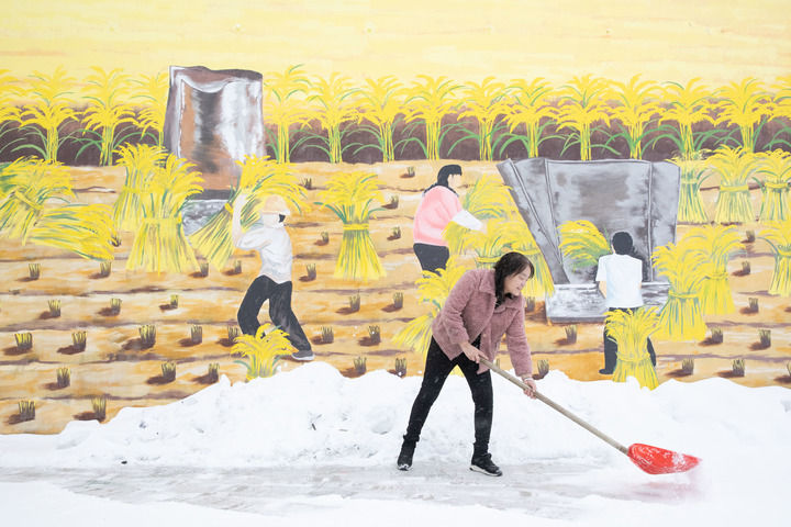 黑龙江省漠河市北极镇北红村“远方故里”民宿负责人张翠花在清理积雪(2023年1月12日摄)