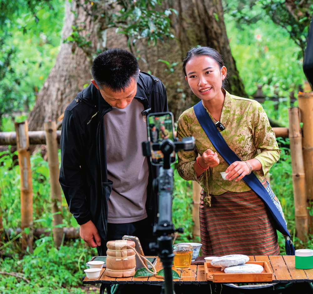 在云南景迈山大平掌古茶林,傣族姑娘仙金(右)在直播售卖普洱茶