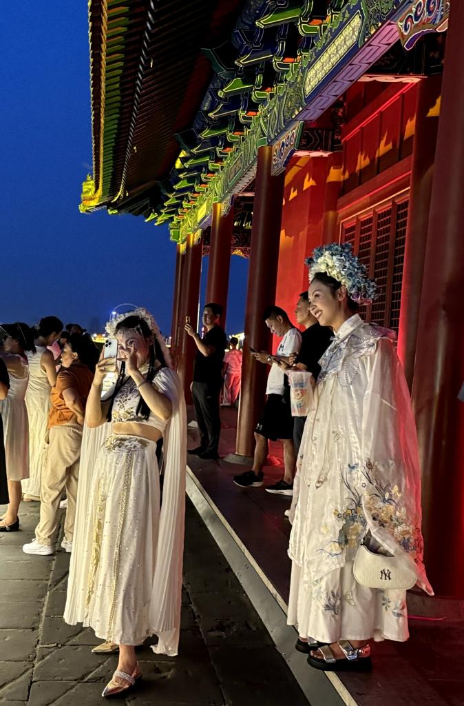 白天,正定古城人头攒动,身着汉服的游客流连于古街古巷之中,传统服饰与古朴建筑相得益彰。晚上,正定小商品夜市人声鼎沸,氤氲的烟火气点亮夜经济、抚慰凡人心。