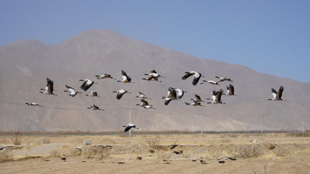 2023年12月,在雅江北岸南木林生态示范区,黑颈鹤在空中自由翱翔。