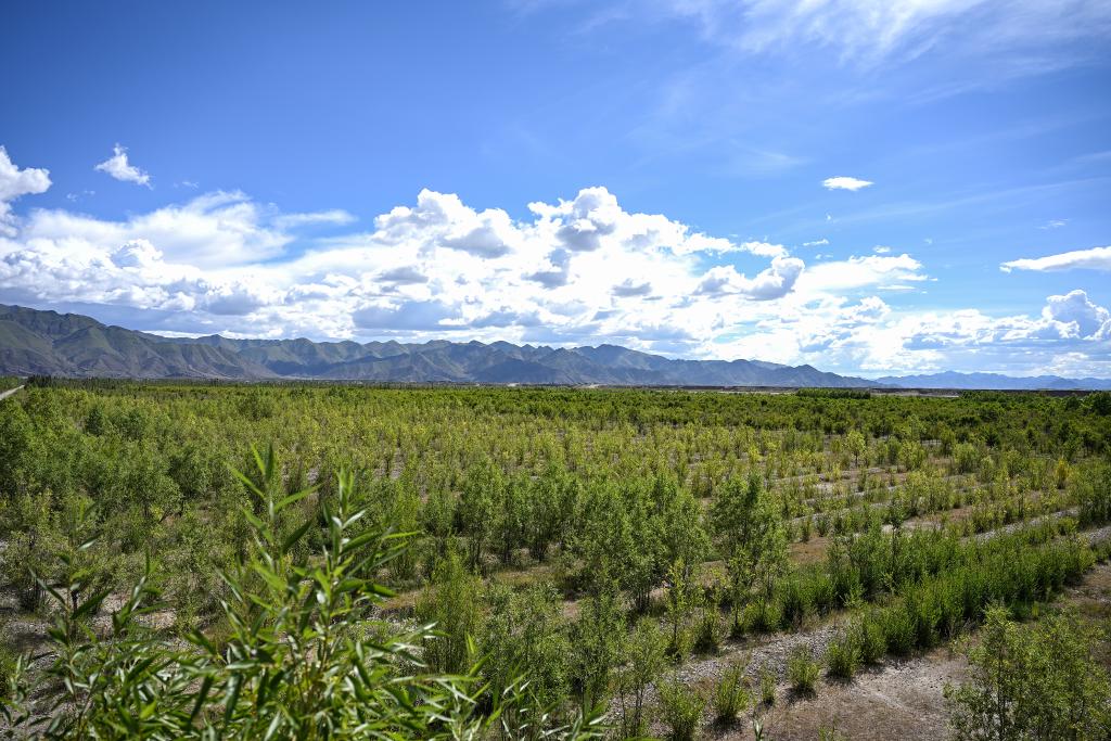 2024年9月1日,在雅江北岸南木林生态示范区,郁郁葱葱的林木和湛蓝的天空相映成景。