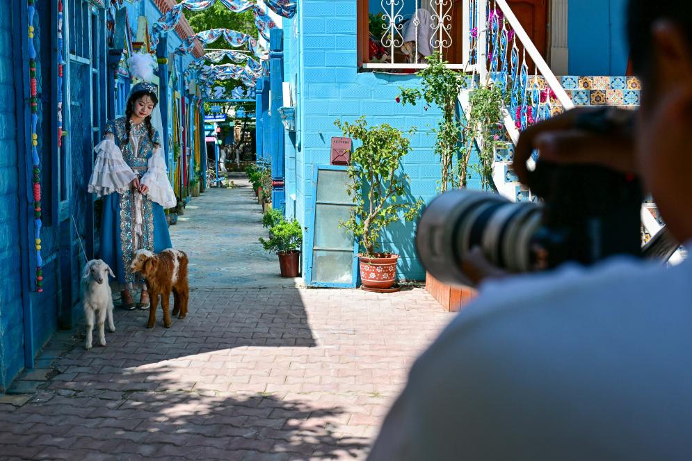 在新疆伊犁哈萨克自治州伊宁市六星街,游客体验旅拍项目。