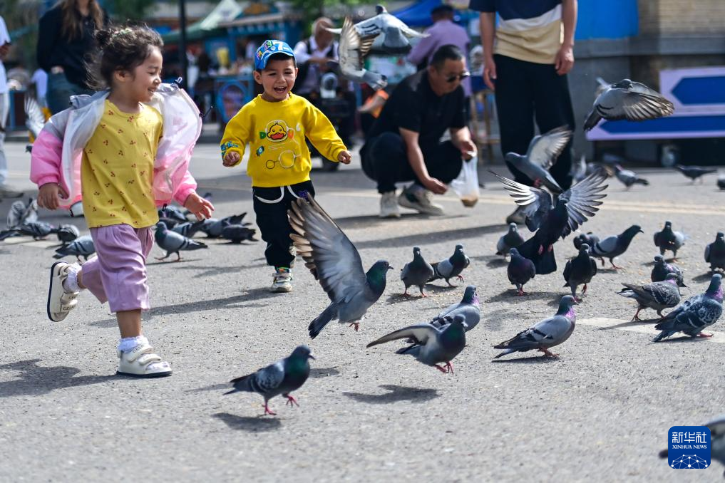 小朋友在新疆伊犁哈萨克自治州伊宁市喀赞其民俗旅游区游玩。
