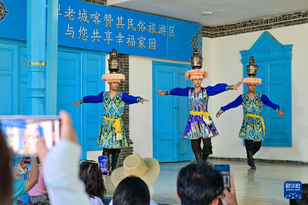 在新疆伊犁哈萨克自治州伊宁市喀赞其民俗旅游区,游客在锡伯车马店欣赏文艺表演。
