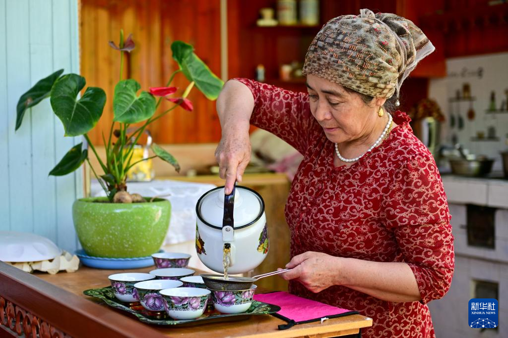 在新疆伊犁哈萨克自治州伊宁市喀赞其民俗旅游区,民宿老板马依兰·赛来洪为游客倒茶。