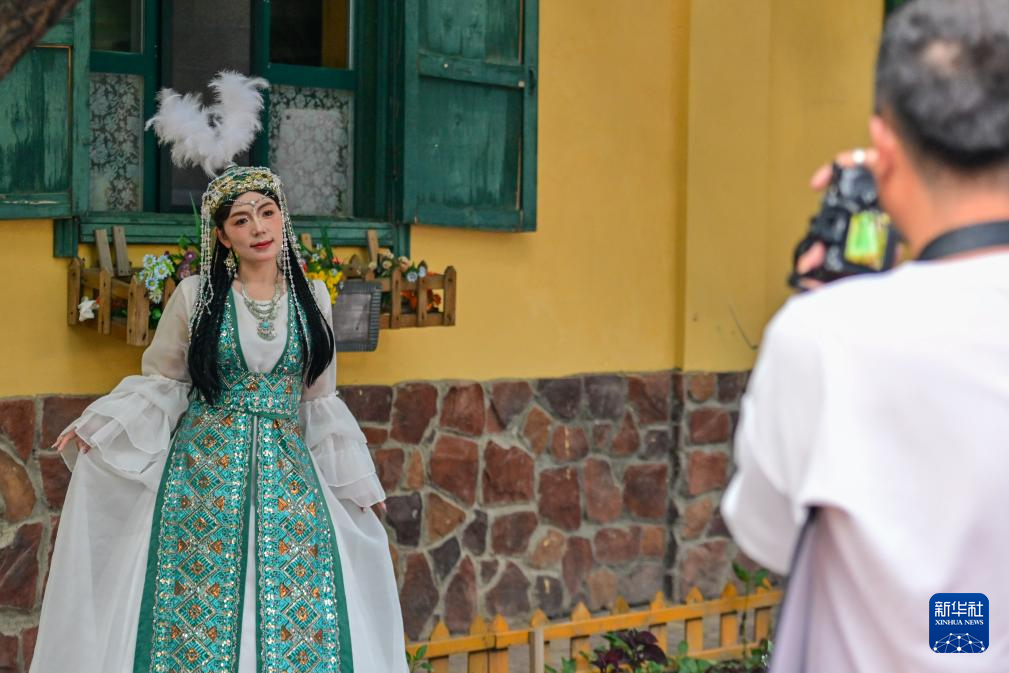 在伊宁市六星街,游客身着民族服饰体验旅拍项目。
