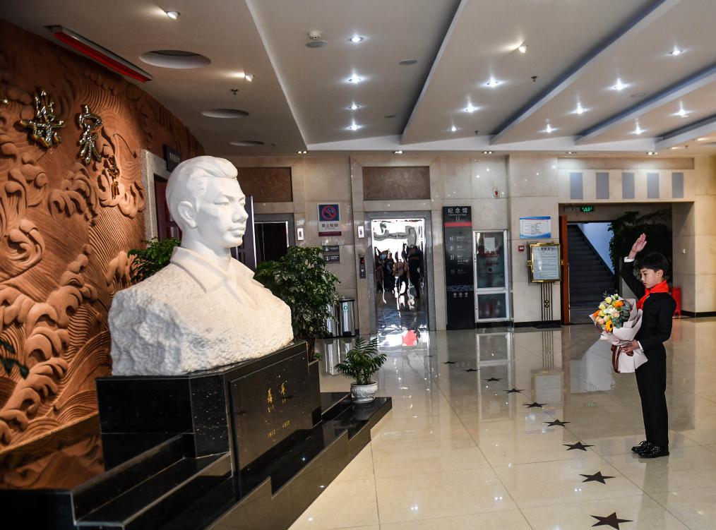 云南省玉溪市的小学生代表在纪念聂耳诞辰110周年活动上向聂耳雕像敬献鲜花。