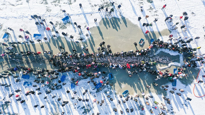 游客在查干湖冰面上观看冬捕(无人机照片)。