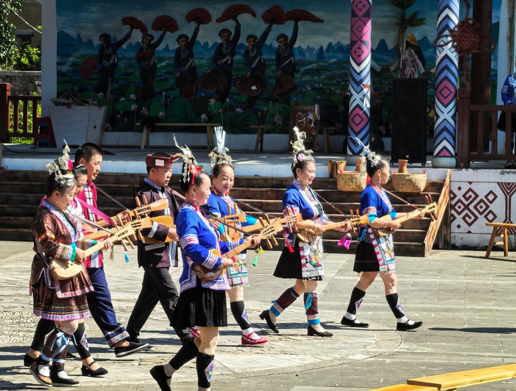 在隘江村陇鉴古寨,村民刚结束一场歌舞表演。