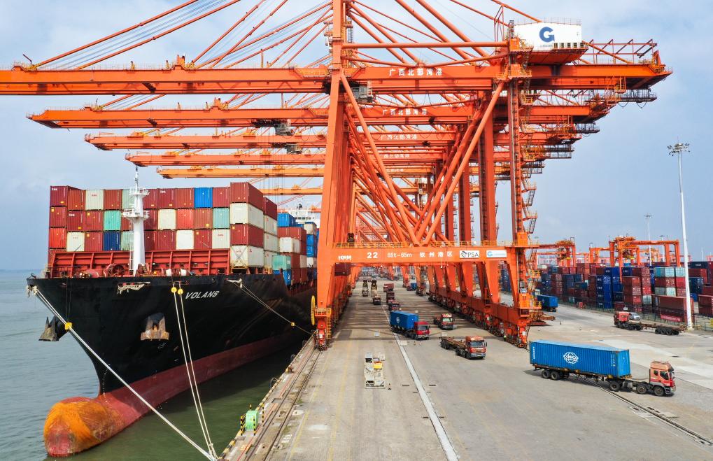 广西北部湾港钦州港区码头,吊车为货轮卸载集装箱。