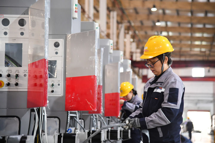 工作人员在位于陕西省渭南市的陕西北人印刷机械有限责任公司生产车间组装产品。