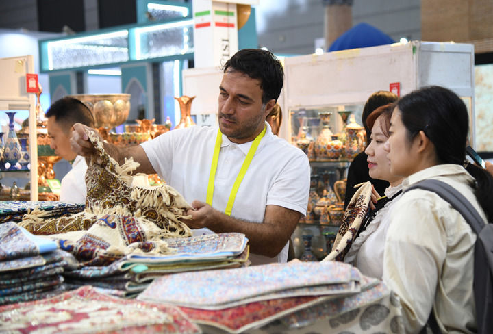 陕西省西安市举行的第八届丝绸之路国际博览会上,来自伊朗的参展商(左一)向观众介绍产品。