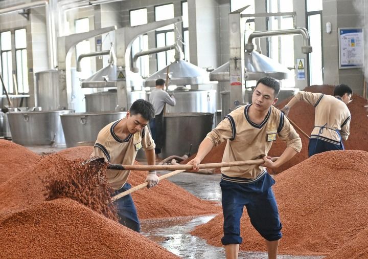 四川古蔺郎酒厂的工人在酿造车间工作。